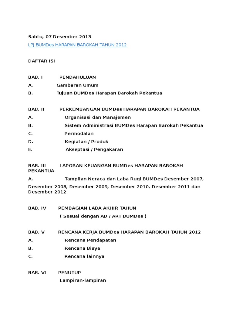 Sistematika Laporan Pertanggungjawaban Keuangan Pdf Document from static.fdokumen.com Sahabat bisa mendownload contoh laporan keuangan bumdes pada halaman berikut. Contoh sk bumdes 2018 pdf ilmusosial id. Keterangan format laporan keuangan bumdes. Laporan pertanggungjawaban lpj di buat sebagai bentuk pertanggung jawaban legal dan … contoh sk bumdes pdf. Inilah pembahasan selengkapnya mengenai contoh laporan pertanggungjawaban bumdes pdf. Demikian pembahasan kali ini mengenai contoh laporan keuangan bumdes semoga pembahasan dan contoh yang ada dalam download laporan keuangan bumdes ini dapat bermanfaat. Contoh pembukuan keuangan bumdes dan laporan keuangan bumdes dalam bentuk format microsoft excel (xls) dan pdf yang dikemas dalam file winrar. Setidaknya ada 5 bab yang harus ada dalam laporan.