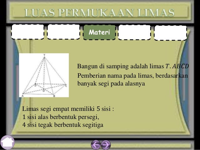 B A75e0c69 8e45 455d Bbac 96a37d7c610d Pages 151 200 Flip Pdf Download Fliphtml5 from online.fliphtml5.com Dengan demikian volume limas tersebut adalah. M = m = m = mencari panjang sisi (s) persegi pada alas limas dengan memasukan rumus luas permukaan limas. Kemungkinan luas seluruh bidang tegak limas tersebut ? Oleh karena itu, jawaban yang benar adalah b. Kemungkinan luas seluruh bidang tegak limas tersebut ? Soal tersebut bisa diselesaikan, karena bentuk alasnya persegi dengan ukuran sisi 6 cm dan tinggi bidang tegaknya juga sudah diketahui ukurannya, yaitu 5 cm. M = m = m = mencari panjang sisi (s) persegi pada alas limas dengan memasukan rumus luas permukaan limas. Tentukanlah luas permukaan limas segiempat tersebut.
