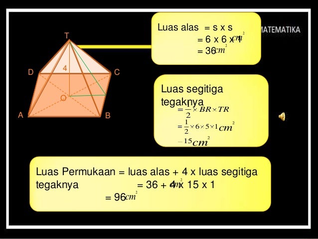 Oleh karena itu, jawaban yang benar adalah b. Luas sisi tegak = 4 x (½ x 20 x 25) = 4 x 10 x 25 = 40 x 25 = 1.000 cm². Misalnya limas persegi memiliki alas persegi yang panjang sisinya. Diketahui alas limas tersebut berbentuk persegi dengan panjang te = 5 cm dan ab = 6 cm. Luas permukaan limas persegi = 96 cm² tinggi limas = 4 cm ditanya :