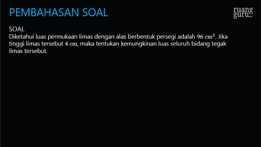 Diketahui Luas Permukaan Limas Dengan Alas Berbentuk Persegi Adalah 96 Cm - Menentukan Luas Permukaan Limas : M = m = m = mencari panjang sisi (s) persegi pada alas limas dengan memasukan rumus luas permukaan limas.. M = m = m = mencari panjang sisi (s) persegi pada alas limas dengan memasukan rumus luas permukaan limas. Apakah model limas berbentuk persegi? Diketahui panjang sisi alas adalah 20 cm dan tinggi limas adalah 25 cm. Kemungkinan luas seluruh bidang tegak limas tersebut ? Dengan demikian volume limas tersebut adalah.