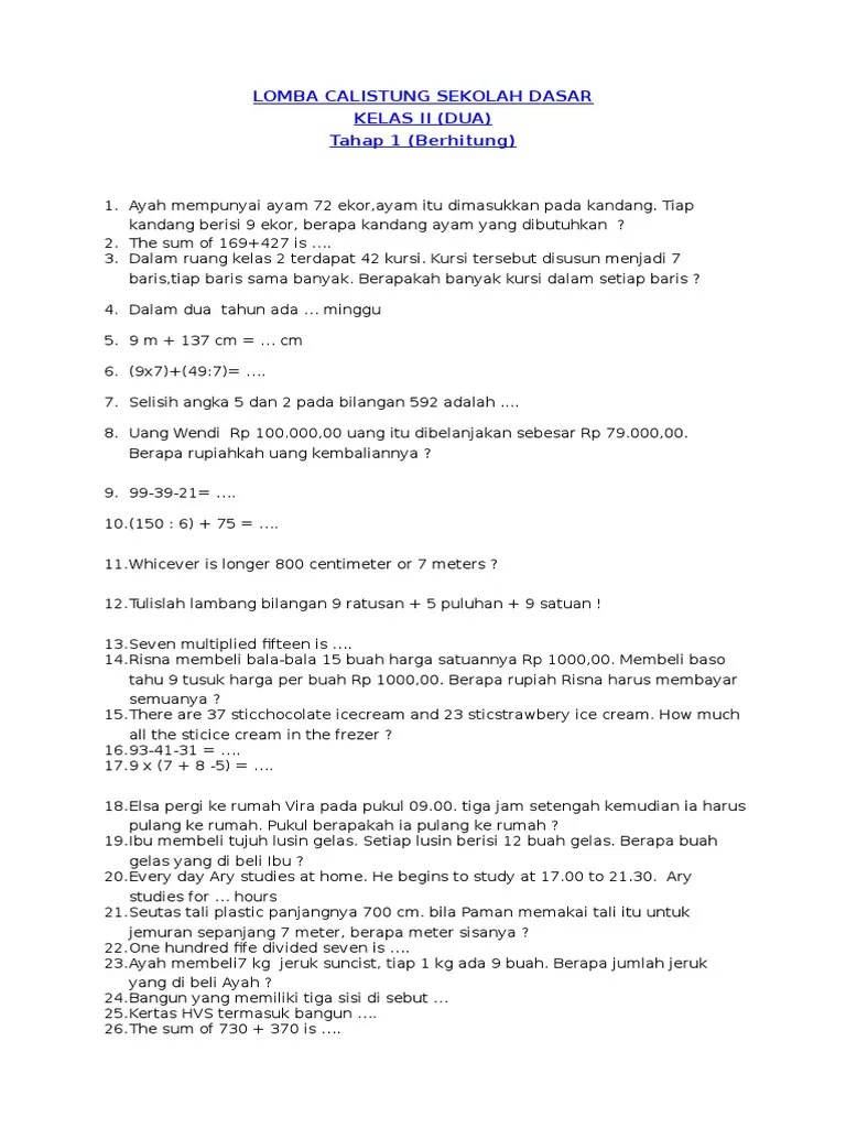 More images for soal calistung kelas 1 tahap 2 » Cianjur tahun 2015 1 pemerintah kabupaten cianjur pusat pembinaan pendidikan tk/sd kecamatan cianjur alamat : Mengingat sering secara rutin dilaksanakannya perlombaan spks seleksi prestasi kreatifitas siswa diberbagai tingkat diantaranya tingkat gugus tingkat kecamatan tingkat kabupaten tingkat provinsi maupun tingkat nasional setiap sekolah mengikuti perlombaan tersebut guna. Mar 23, 2015 · calistung kelas 2 tahap 1. Kegiatan lomba calistung bertujuan untuk menambah minat bakat peserta didik dalam membaca, menulis dan menghitung semakin bertambah.
